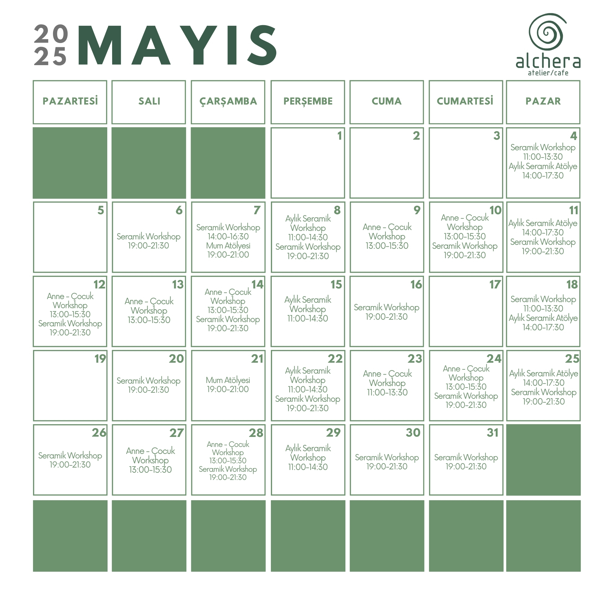 Seramik aylık eğitimler haftada 1 gün 3 buçuk saat süreli ve 4 hafta devam eden atölyelerdir. Boya harici tüm malzemeler atölyeye ait olmakla birlikte istediğiniz kadar ürün çıkarabilirsiniz. Bu süre içerisinde tüm teknik bilgiler size aktarılır ve eğitmen eşliğinde istediğiniz tüm tasarımları yapabilirsiniz.